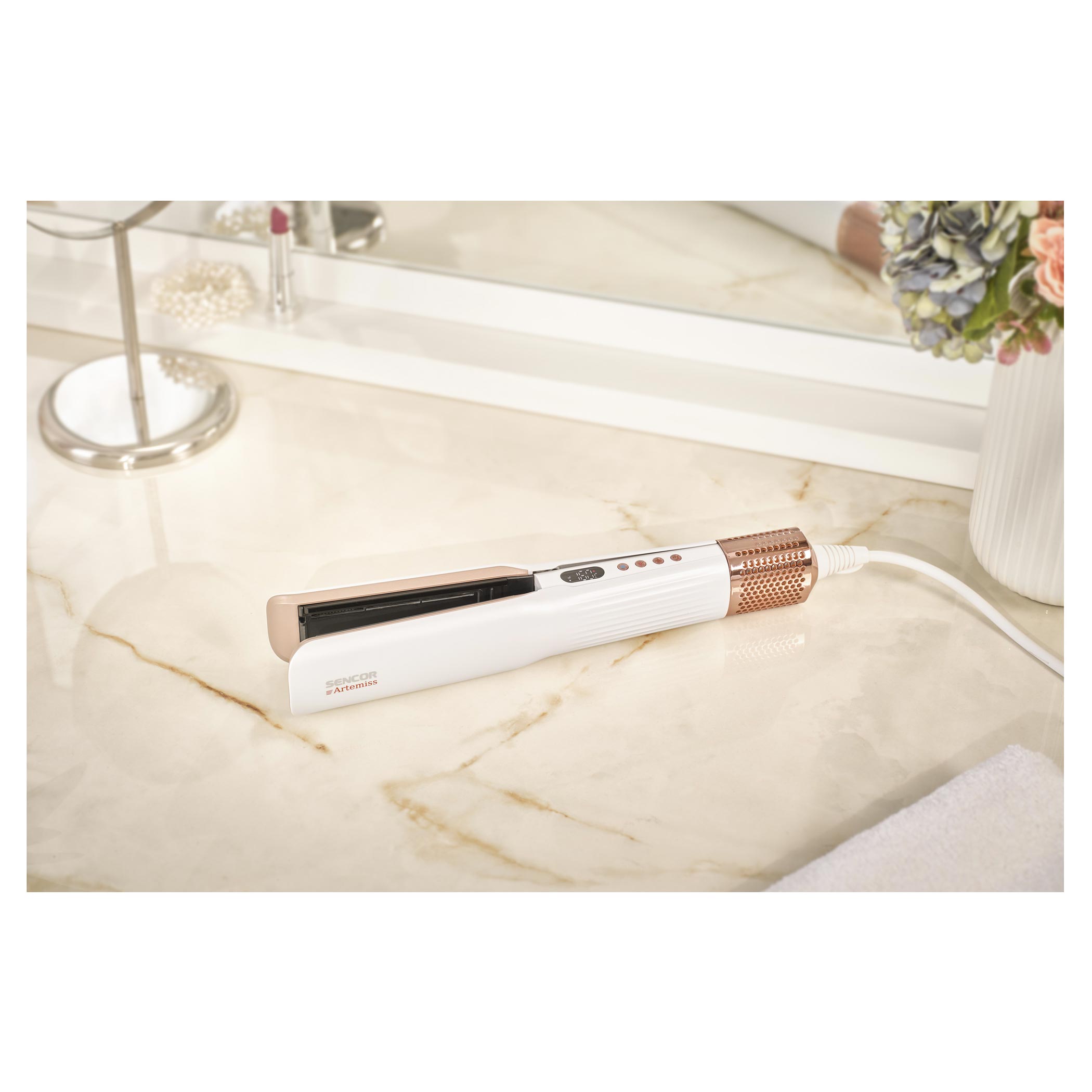 Aeroprostownica Artemiss SHI 9100RS to urządzenie, które redefiniuje codzienną stylizację. Dzięki innowacyjnej technologii stylizuje włosy przy użyciu znacznie niższej temperatury niż w tradycyjnych prostownicach. Wysokiej prędkości strumień powietrza jednocześnie suszy i prostuje włosy, zachowując ich naturalną gładkość, siłę i blask – a to wszystko w zaledwie 6–8 minut.