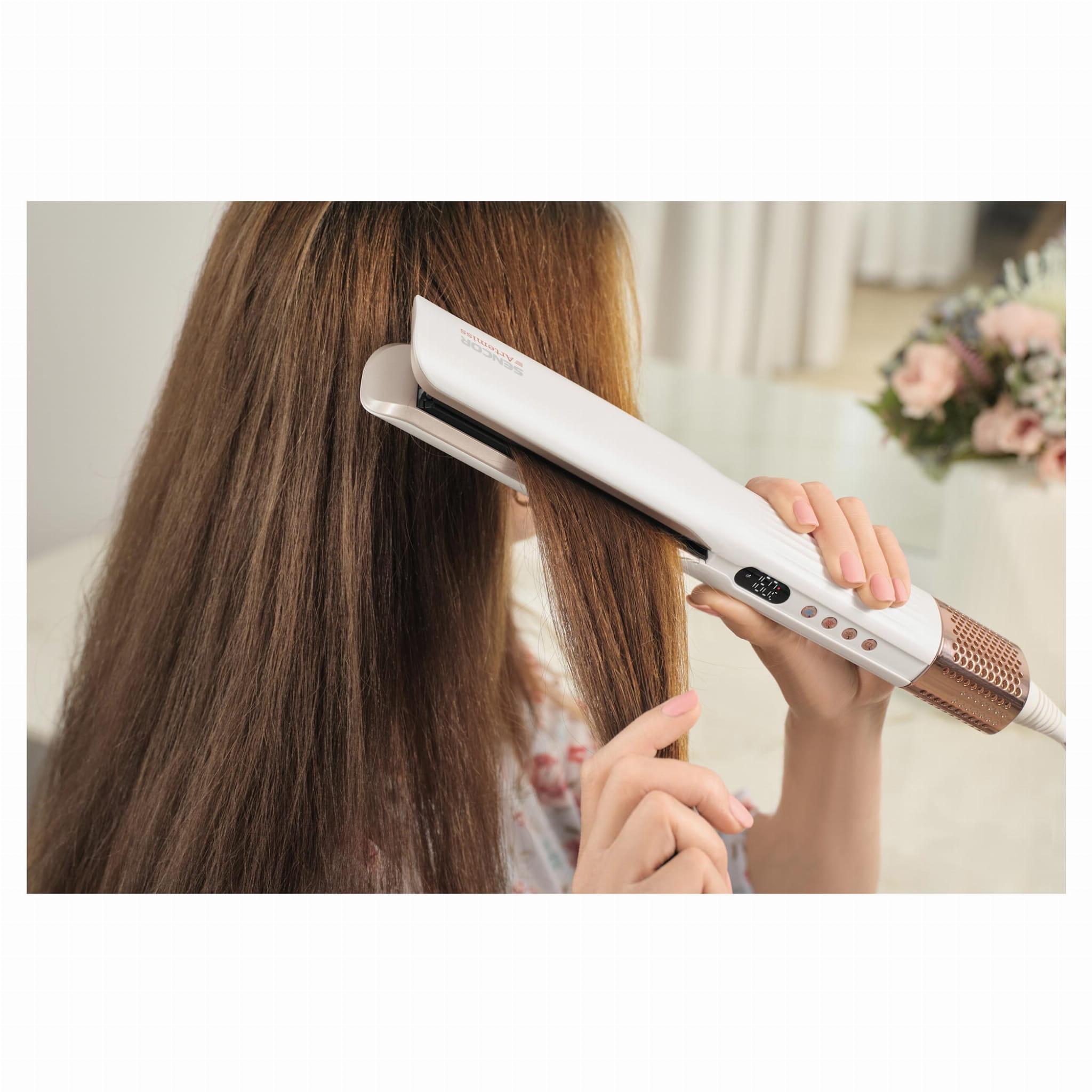 - Prostowanie przy niższej temperaturze.Silny przepływ powietrza suszy i prostuje włosy jednocześnie, nie uszkadzając ich
