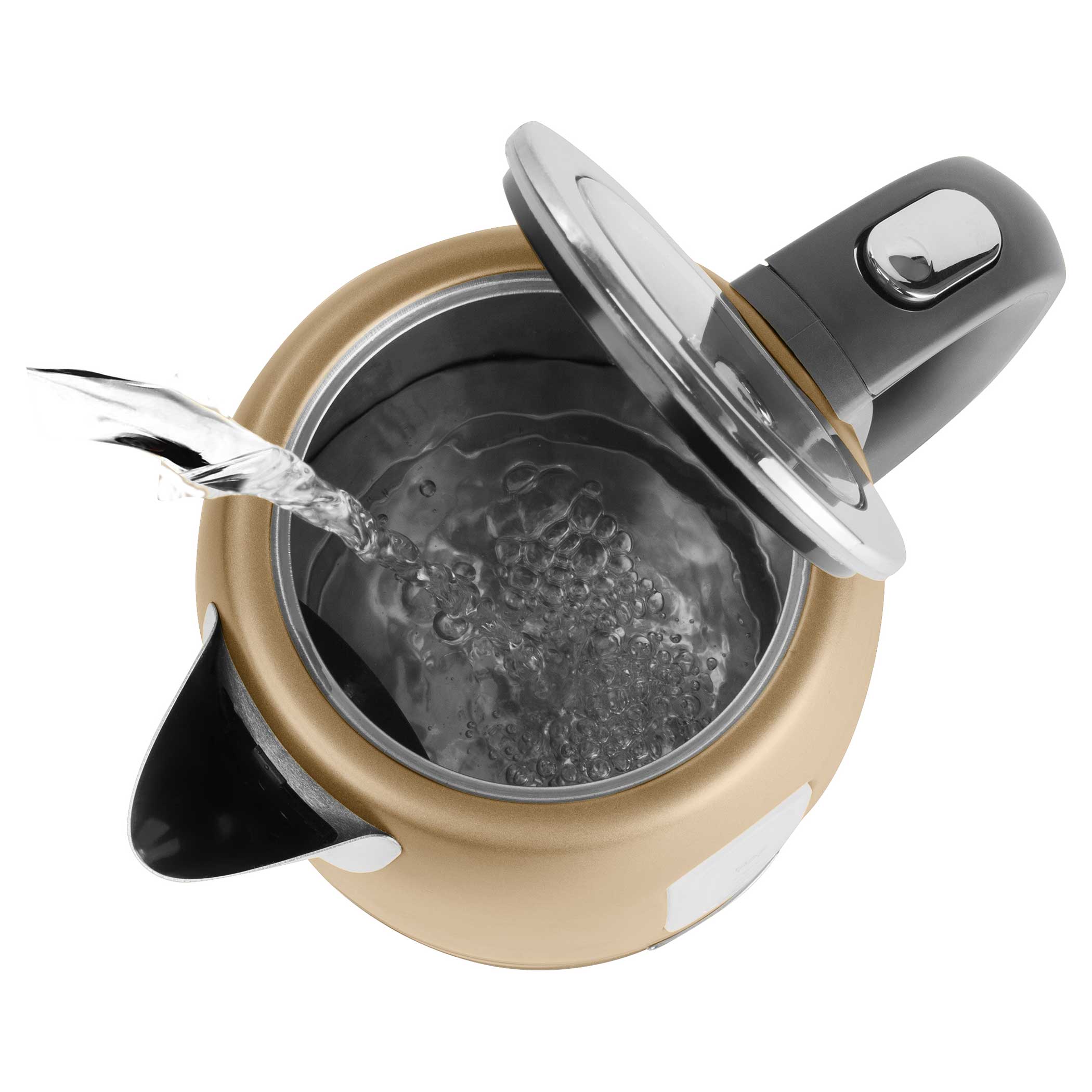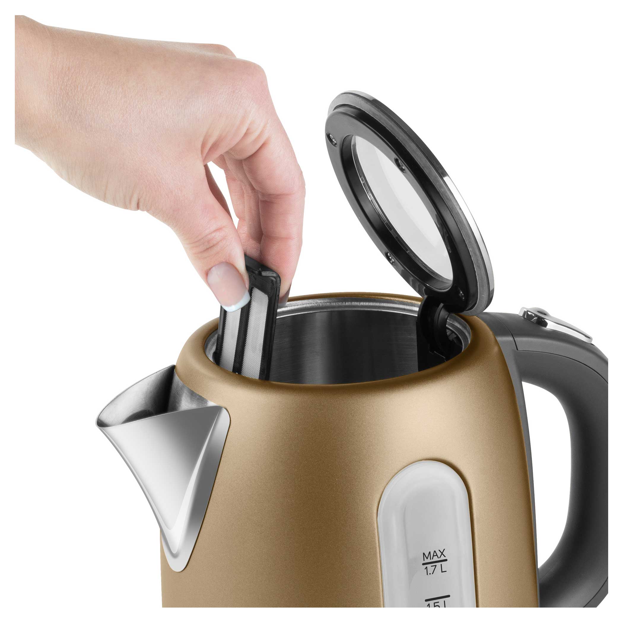 - Dodatkowo: szereg zabezpieczeń, środkowe złącze 360°, schowek na przewód zasilający w podstawie, kontrolka świetlna pracy, wyjmowany filtr antywapienny, wskaźnik wody, ergonomiczny uchwyt
