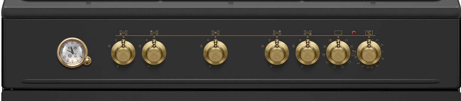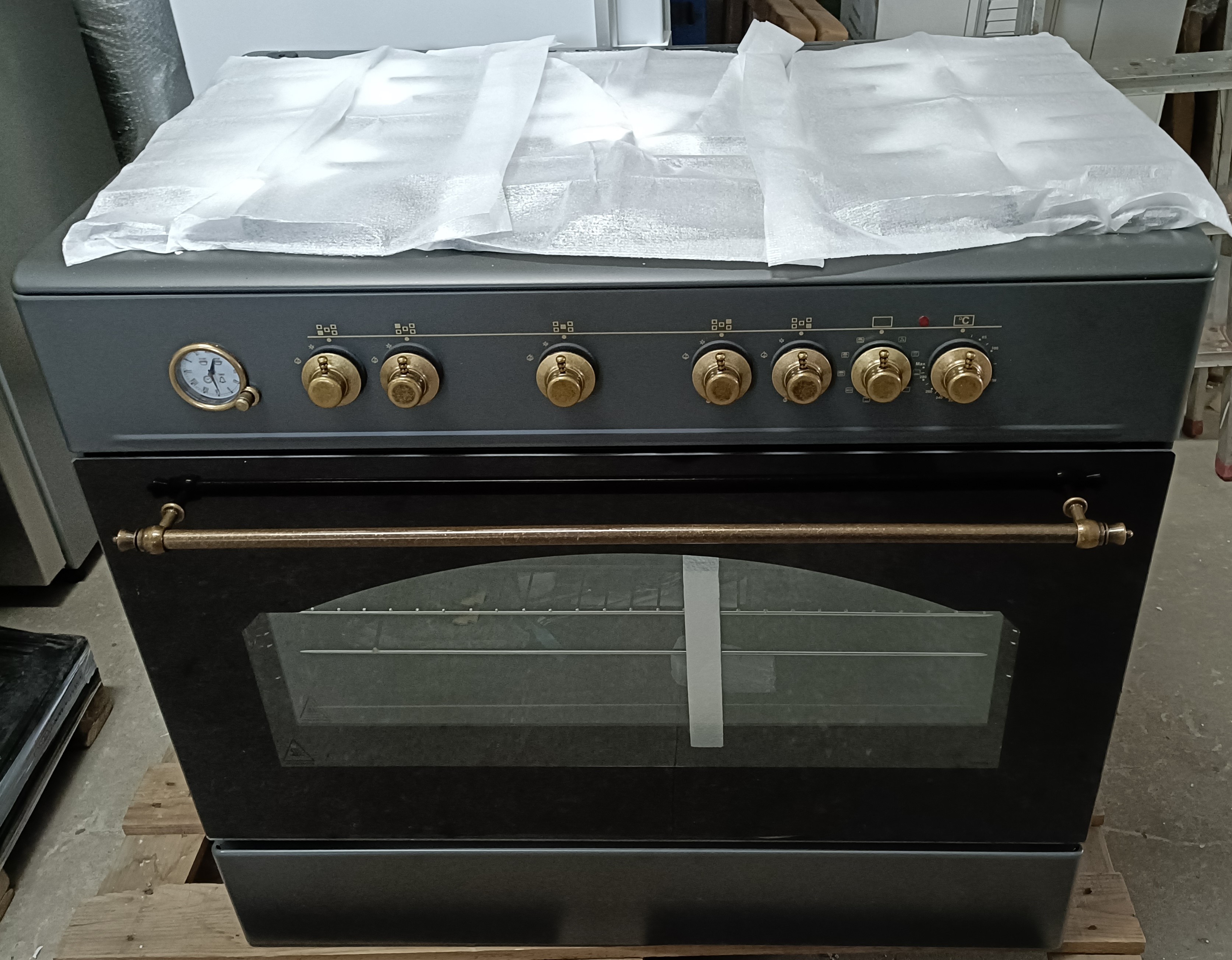Kuchnia gazowo elektryczna w stylu retro w kolorze grafitowym (czarnym). Kuchnia z piekarnikiem elektrycznym z termoobiegiem i rożnem na dwa kurczaki