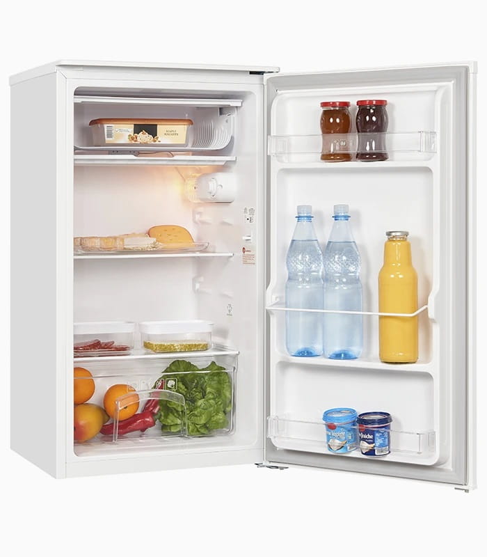 Lodówka posiada zintegrowaną regulację temperatury (ręczną). Dzięki 2 szklanym półkom w komorze lodówki i 3 półkom na drzwiach, żywność można przechowywać w elastyczny sposób. Regulowane na wysokość nóżki (2 z przodu) pozwalają na łatwe dopasowanie do powierzchni i montaż w wybranym miejscu.