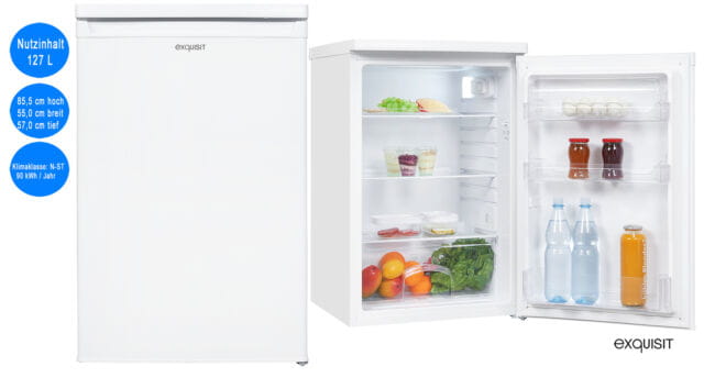 Chłodziarka zapewnia wygodne i bezpieczne przechowywanie żywności i napojów. Dostępnych jest łącznie 127 litrów pojemności użytkowej. Urządzenie ma wymiary 85 x 55 x 58 cm (wysokość/szerokość/głębokość) i posiada klasę efektywności energetycznej E (skala klasy efektywności energetycznej od A do G). Dzięki wolnostojącej konstrukcji można ją ustawić i uruchomić w dowolnym miejscu. Urządzenie oferuje ponad 127 litrów pojemności użytkowej w obszarze chłodzenia, który jest praktycznie podzielony za pomocą częściowo regulowanych półek. Komora na warzywa sprawia, że owoce i warzywa są zawsze chrupiące i świeże. Przegródki na butelki i masło zapewniają porządek w lodówce. Urządzenie oferuje jasne oświetlenie wnętrza.