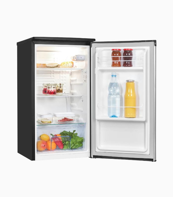 Chłodziarka zapewnia wygodne i bezpieczne przechowywanie żywności i napojów. Do Państwa dyspozycji jest łącznie 82 litrów pojemności użytkowej. Czarne urządzenie z drzwiami inox ma wymiary 84,3 x 45,0 x 45,4 cm (wysokość/szerokość/głębokość) i posiada klasę efektywności energetycznej E. Dzięki swojej wolnostojącej konstrukcji można go ustawić i uruchomić w dowolnym miejscu. Wymienny ogranicznik drzwi zapewnia jeszcze większą elastyczność podczas ustawiania. Urządzenie oferuje ponad 75 litrów użytecznej pojemności w swojej strefie chłodzenia, która jest praktycznie podzielona za pomocą częściowo regulowanych półek. Komora na warzywa utrzymuje owoce i warzywa przez cały czas chrupiące i świeże. Urządzenie oferuje oświetlenie, dzięki któremu możesz niezawodnie dotrzeć do jedzenia nawet w złych warunkach oświetleniowych. Automatyczne rozmrażanie. Wymiary 84,3 x 45,0 x 45,4 cm. Zasilanie 220-240V. Moc sprężarki 70W. Zużycie energii 84kWh/rok. Głośność pracy 41dB. (klasa C).