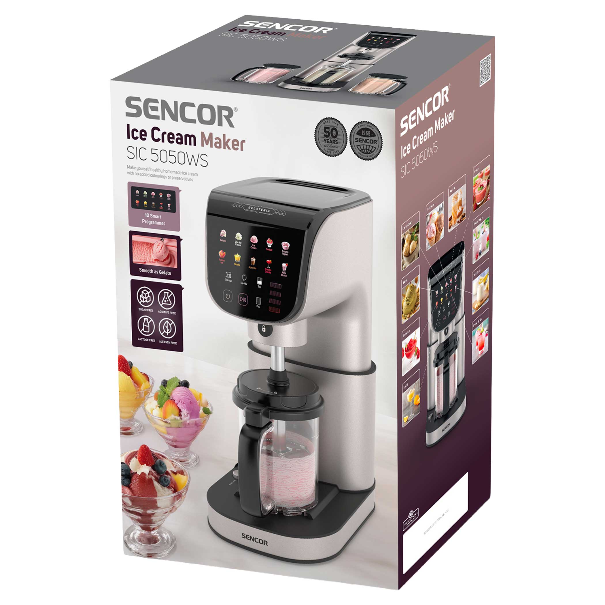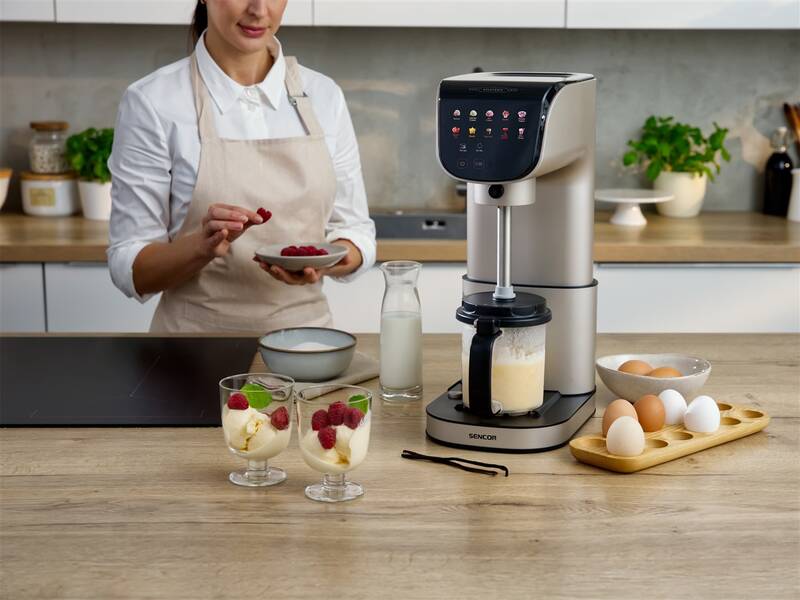 Maszyna do lodów SIC 5050WS GELATERIA pozwala w kilka minut przygotować zdrowe, domowe lody i desery mrożone bez sztucznych barwników i konserwantów. Urządzenie wyposażone jest w trzy pojemniki o łącznej pojemności 1,5 l, co umożliwia jednoczesne przygotowanie trzech smaków deseru. Intuicyjne sterowanie dotykowe oraz kolorowy wyświetlacz LED zapewniają wygodę obsługi, a silnik BLDC o mocy 500 W pracuje bardzo cicho. SIC 5050WS oferuje 10 inteligentnych programów przygotowania lodów i napojów mrożonych, w tym Gelato, Ice Cream, Sorbet, Frozen Yogurt, Slushi, Icyccino, Frozen Drinks czy Milk Shake, co sprawia, że każdy deser jest perfekcyjny i dostosowany do indywidualnych upodobań. Dzięki łatwemu czyszczeniu urządzenie jest wygodne w codziennym użytkowaniu.