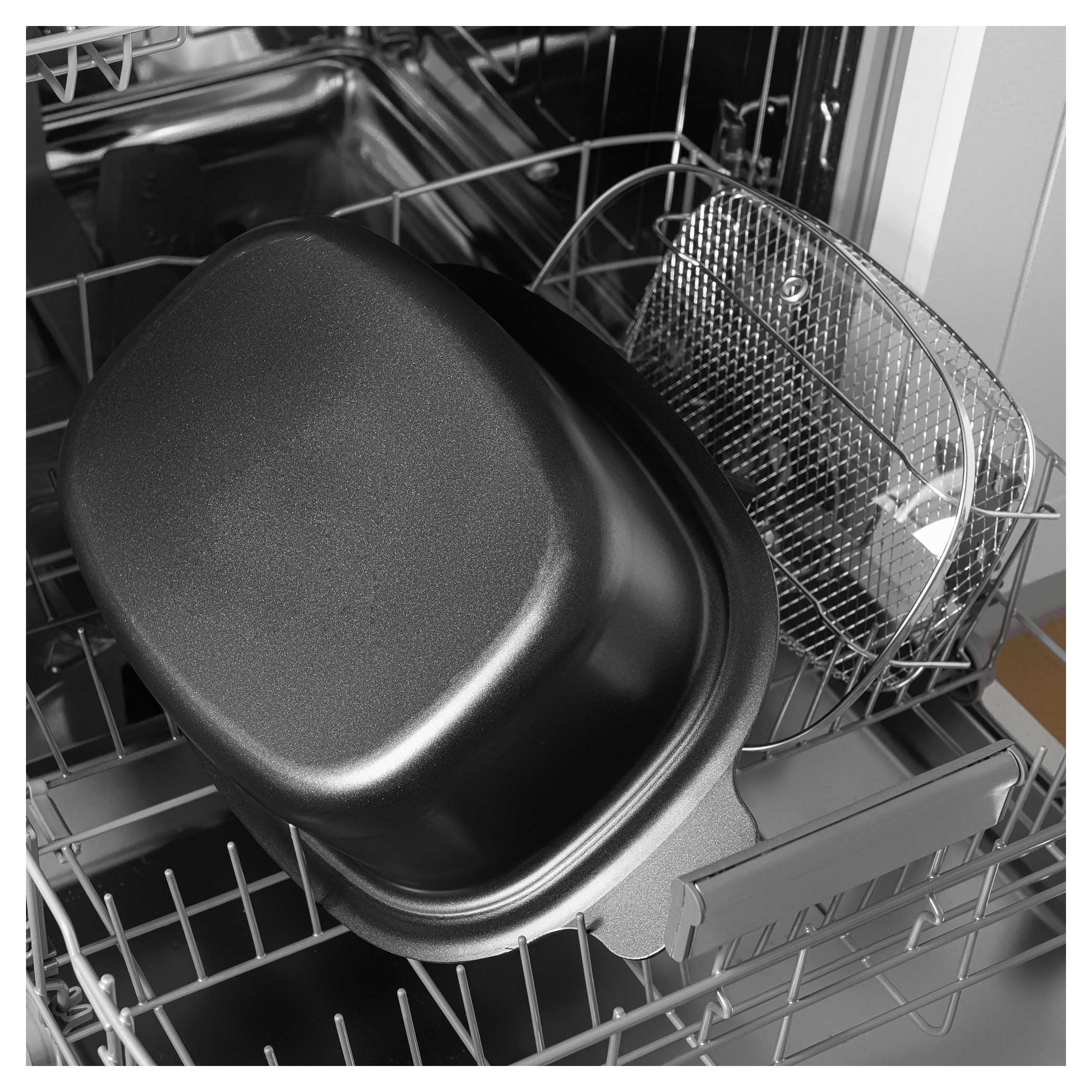 Naczynie do gotowania ma pojemność 5,5 l i jest wyposażone w wysokiej jakości nieprzywierającą powłokę. Wolnowar idealnie przewodzi ciepło dzięki wykończeniu z aluminium, która sprawdza się zarówno podczas tradycyjnego gotowania, gotowania na parze czy smażenia. Odpowiedni kształt naczynia pozwala na równomierne rozprowadzanie po nim ciepła, a co za tym idzie na równomierne przyrządzanie potraw. Wystarczy pokroić składniki, wrzucić je do garnka, wybrać tryb i nie martwić się o resztę. Po powrocie do domu będziesz mieć gotowe do podania jedzenie.