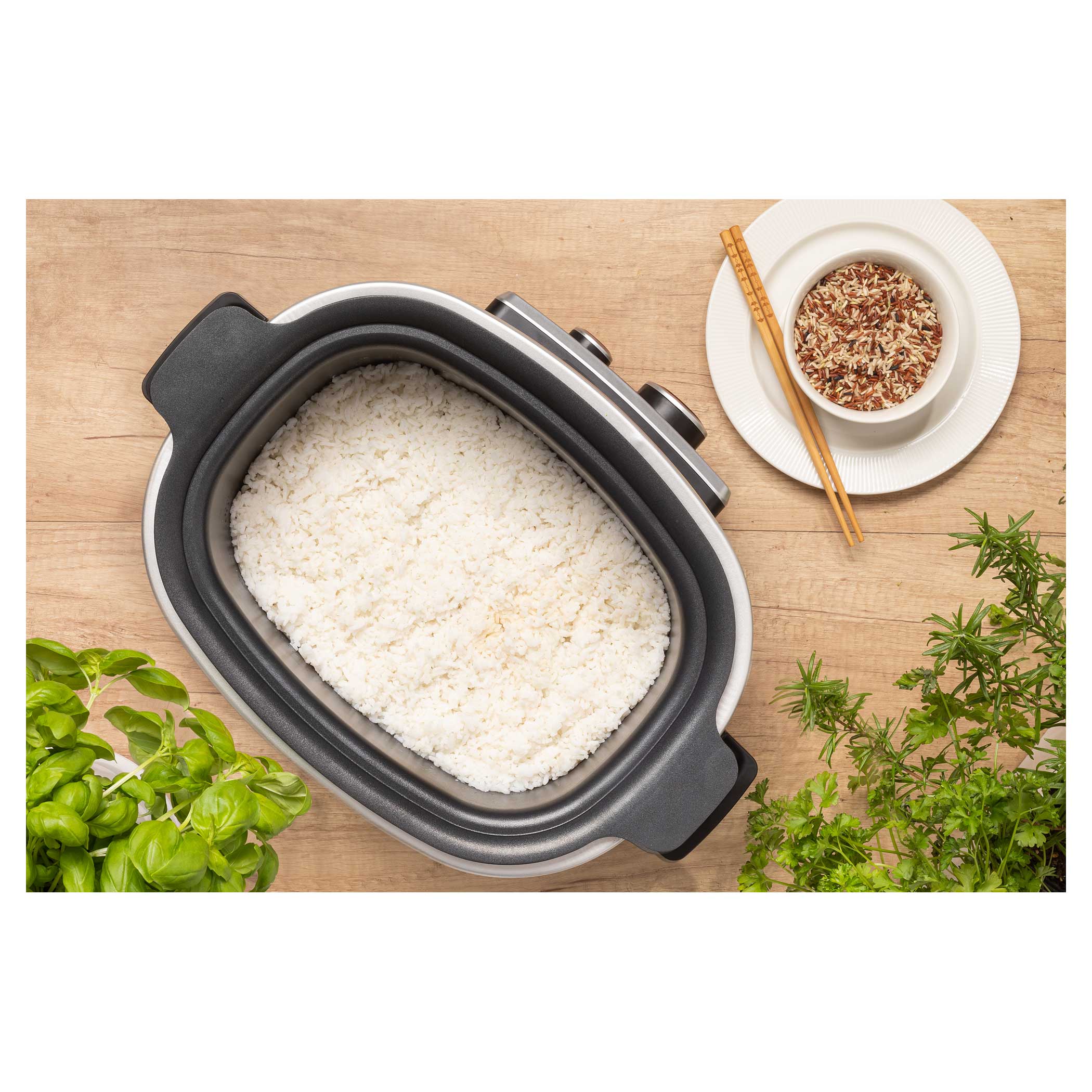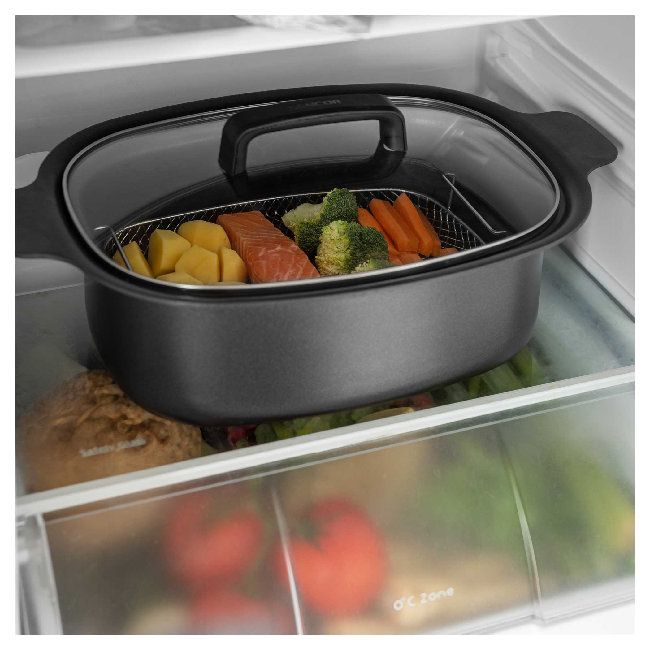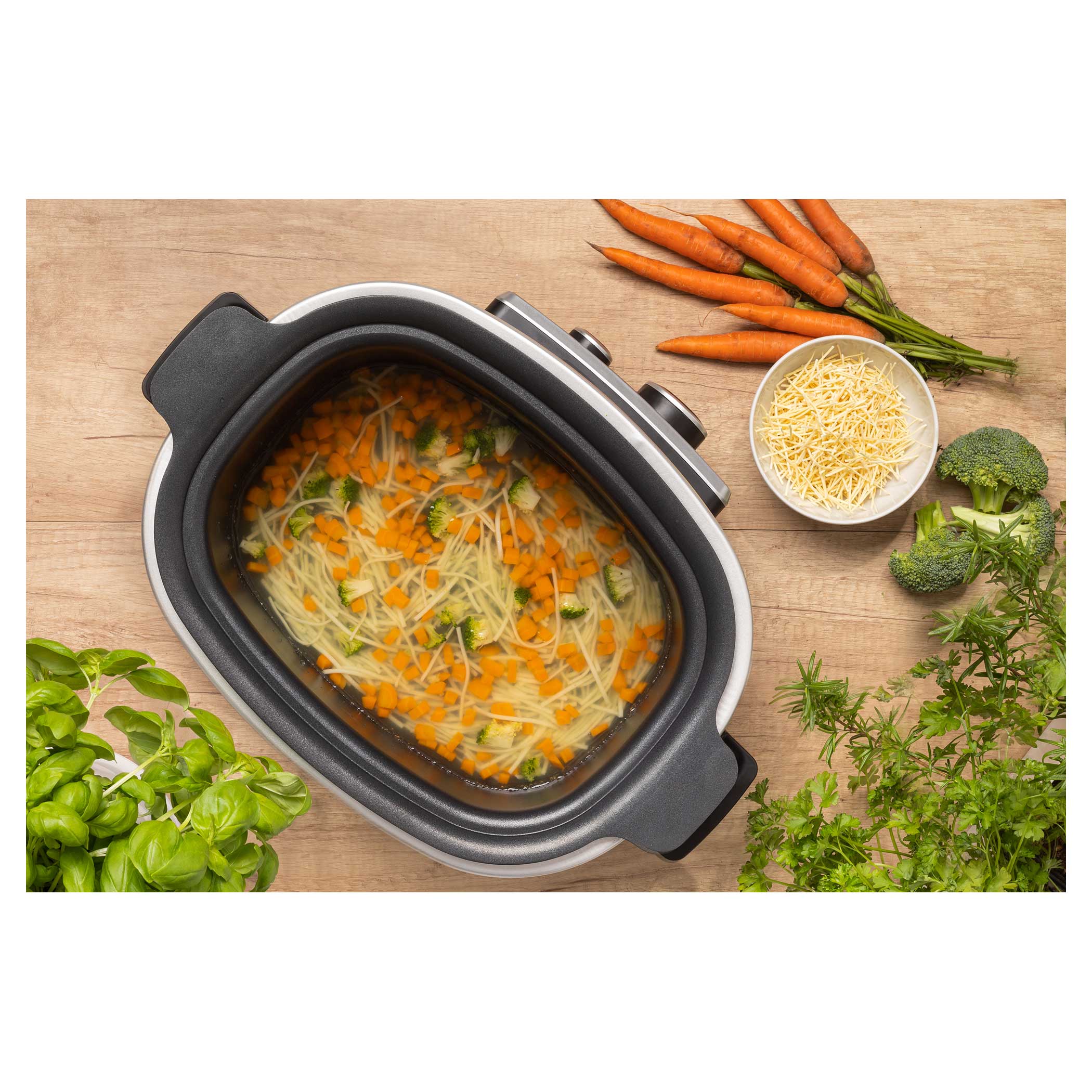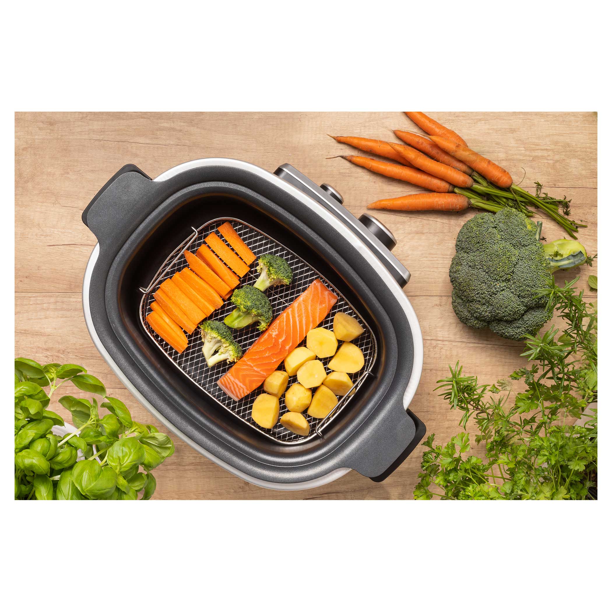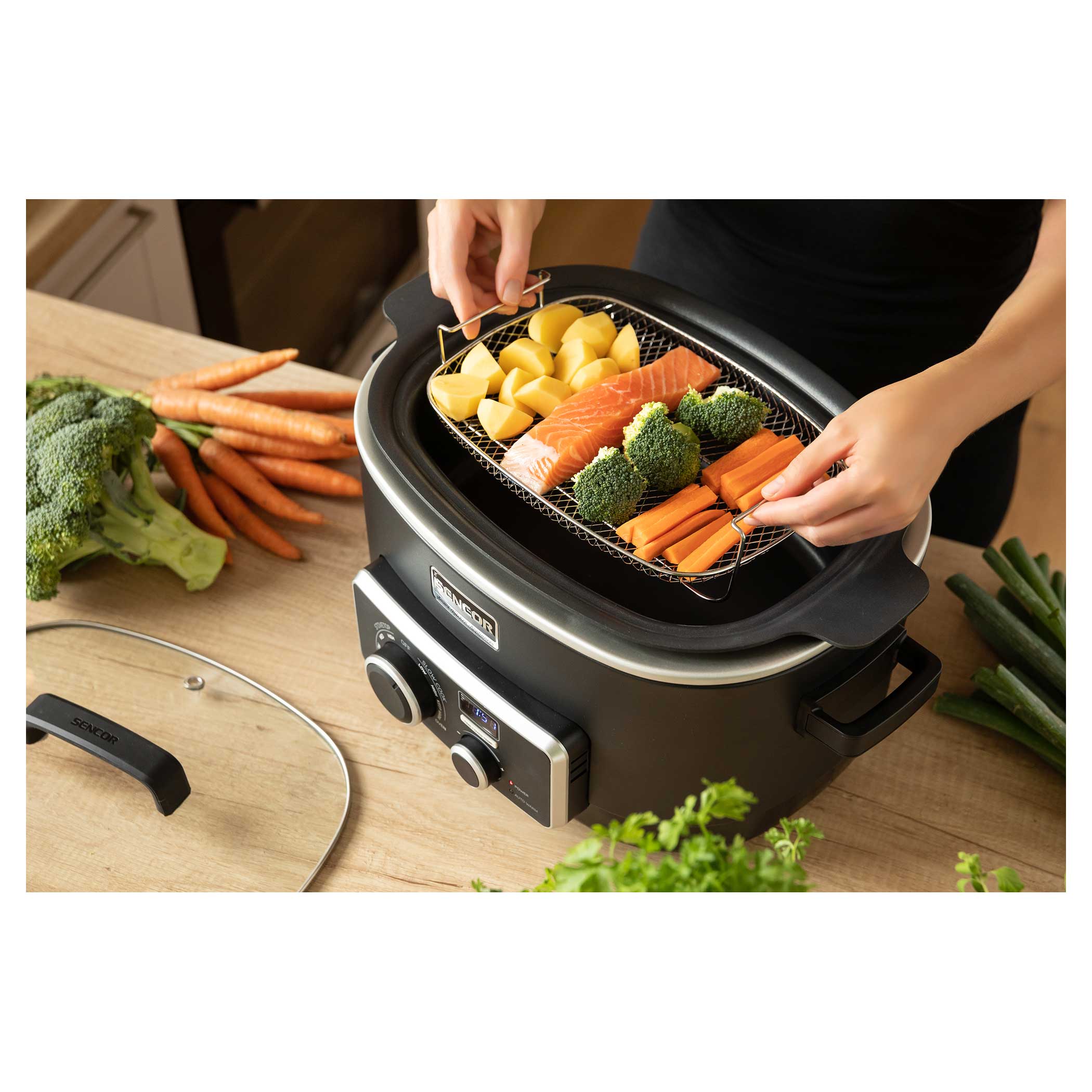 Gotowanie na parze to metoda obróbki cieplnej potraw uważana za jedną z najzdrowszych, ponieważ dzięki parze przygotowana potrawa zachowuje składniki odżywcze, witaminy i minerały. Ponieważ żywność nie jest zanurzona w wodzie, zachowuje znacznie lepszy smak i kolor. Masz ochotę na kawałek mięsa z duszonymi warzywami? Po prostu włóż kosz do gotowania na parze do wolnowara i wybierz odpowiedni tryb.