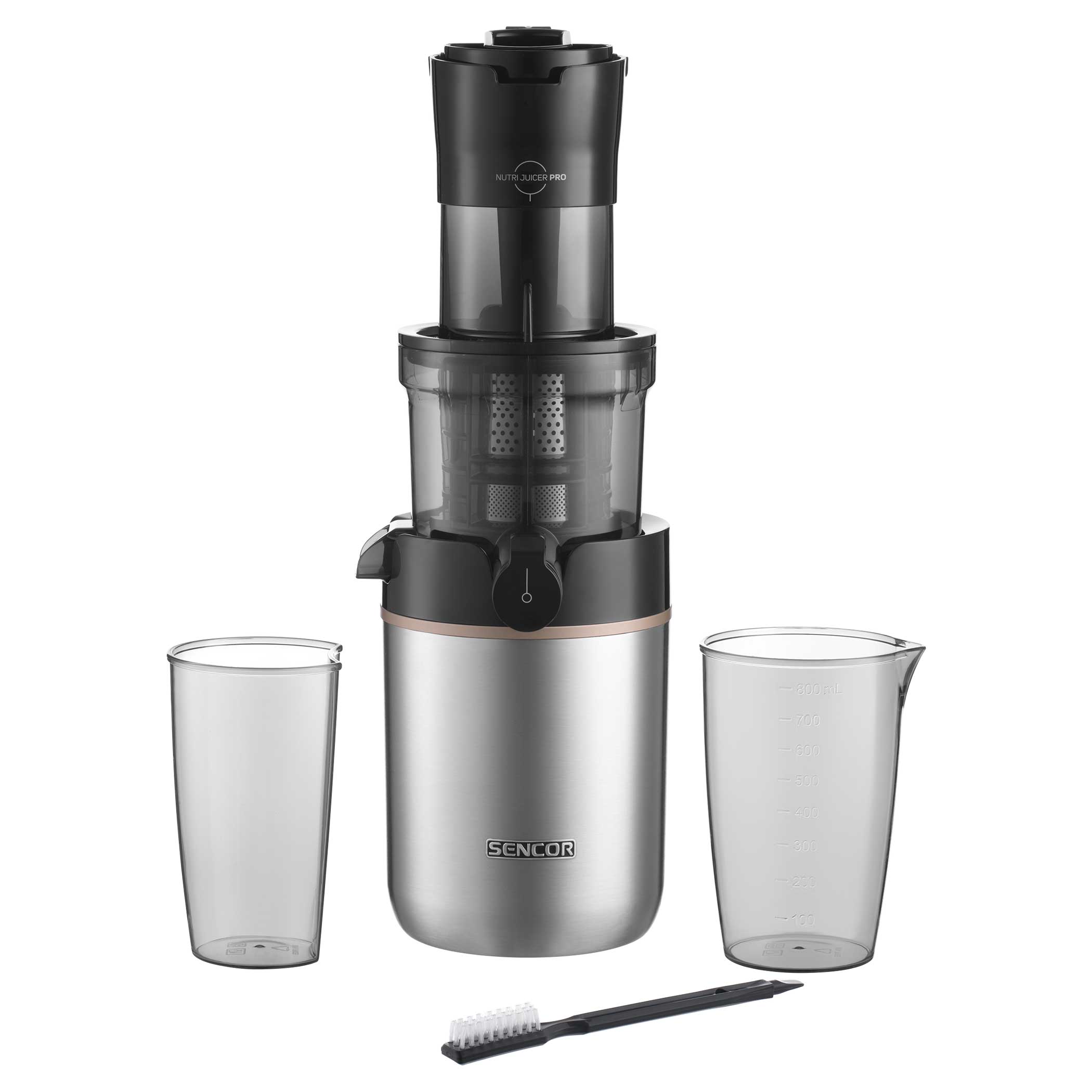 Akcesoria: pojemnik na sok o pojemności 800 ml, pojemnik na miąższ o pojemności 600 ml, szczotka do czyszczenia, ubijak